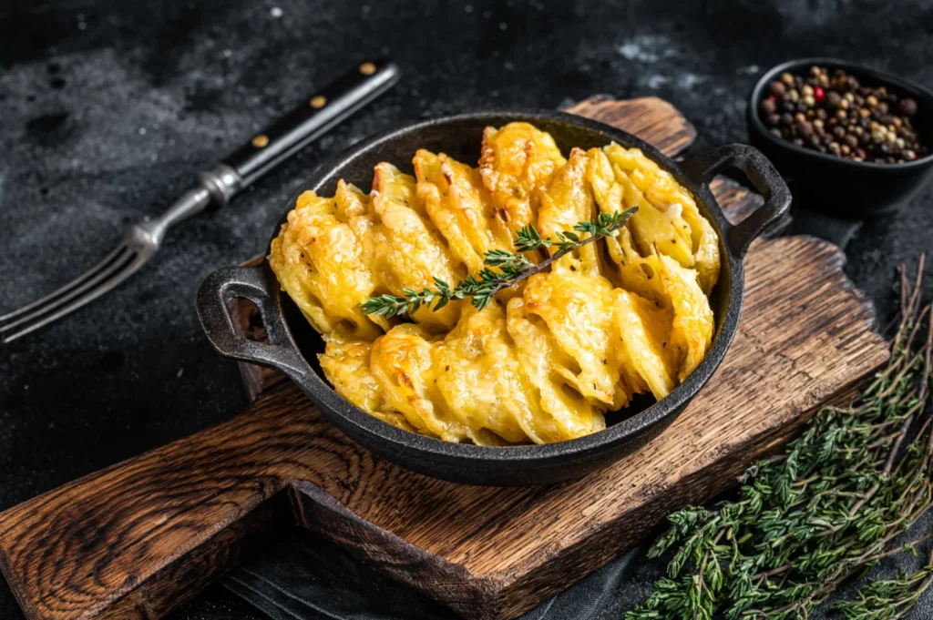 Temps de cuisson : 45-60 minutes Épluchez et tranchez finement les pommes de terre. Disposez-les dans un plat à gratin, en alternant avec de la crème fraîche, du fromage râpé, du sel et du poivre. Faites cuire au four à 180°C jusqu’à ce que le dessus soit doré.